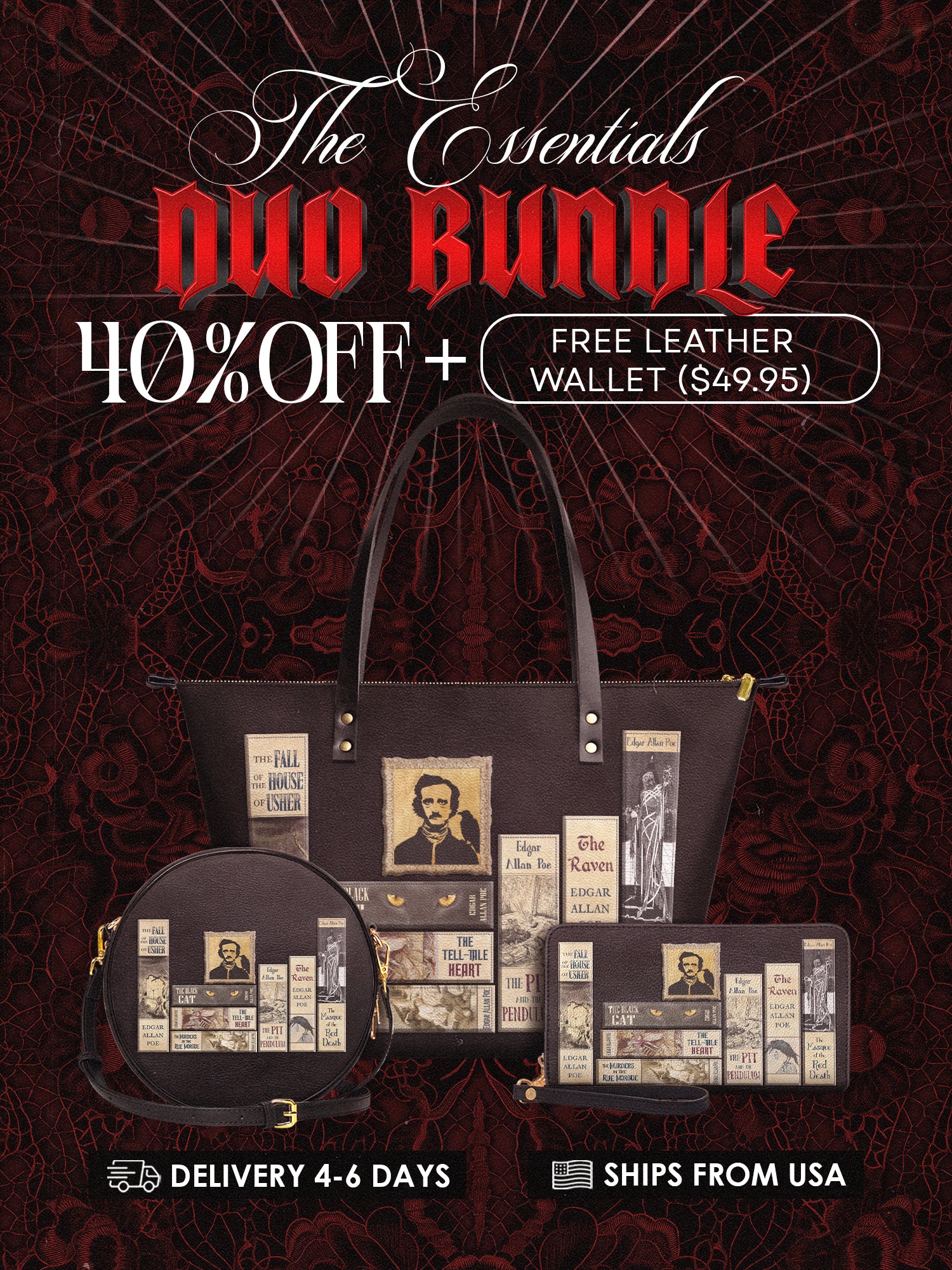 The exterior unfurls like the pages of Poe's own library, adorned with vintage-style book spines in embossed midnight-black titles like: The Tell-Tale Heart and The Fall of the House of Usher marching in solemn procession across the obsidian hide.