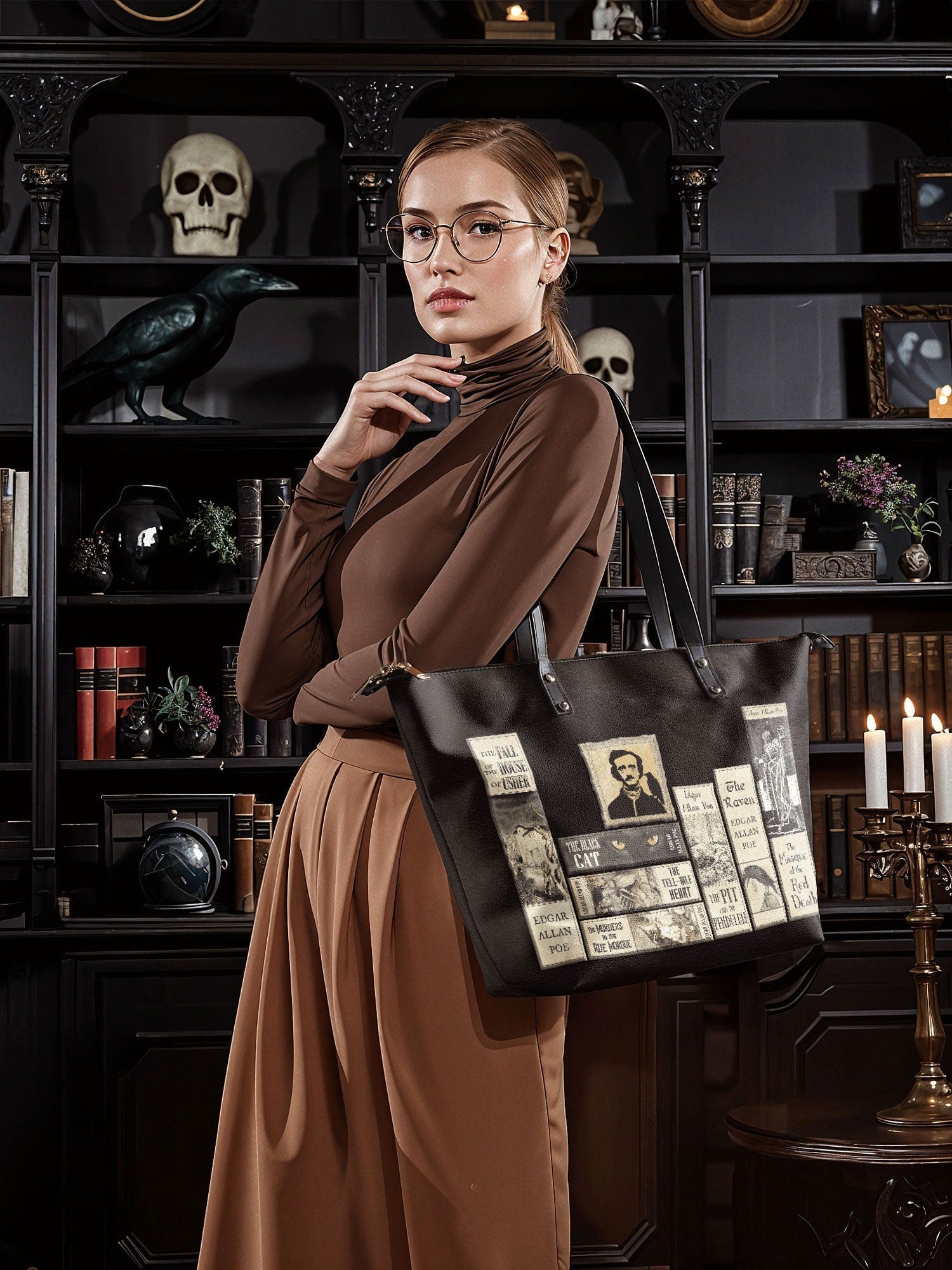 This tote is the chameleon of the crypt: sling it over a wool cape for windswept walks reciting Annabel Lee, or pair it with tailored blacks for a midnight masquerade.