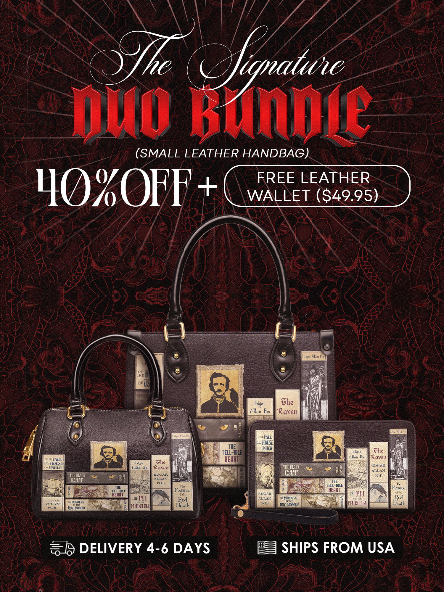 "Poe's Library" Ashen Black The Signature Duo Bundle (Small Leather Handbag)