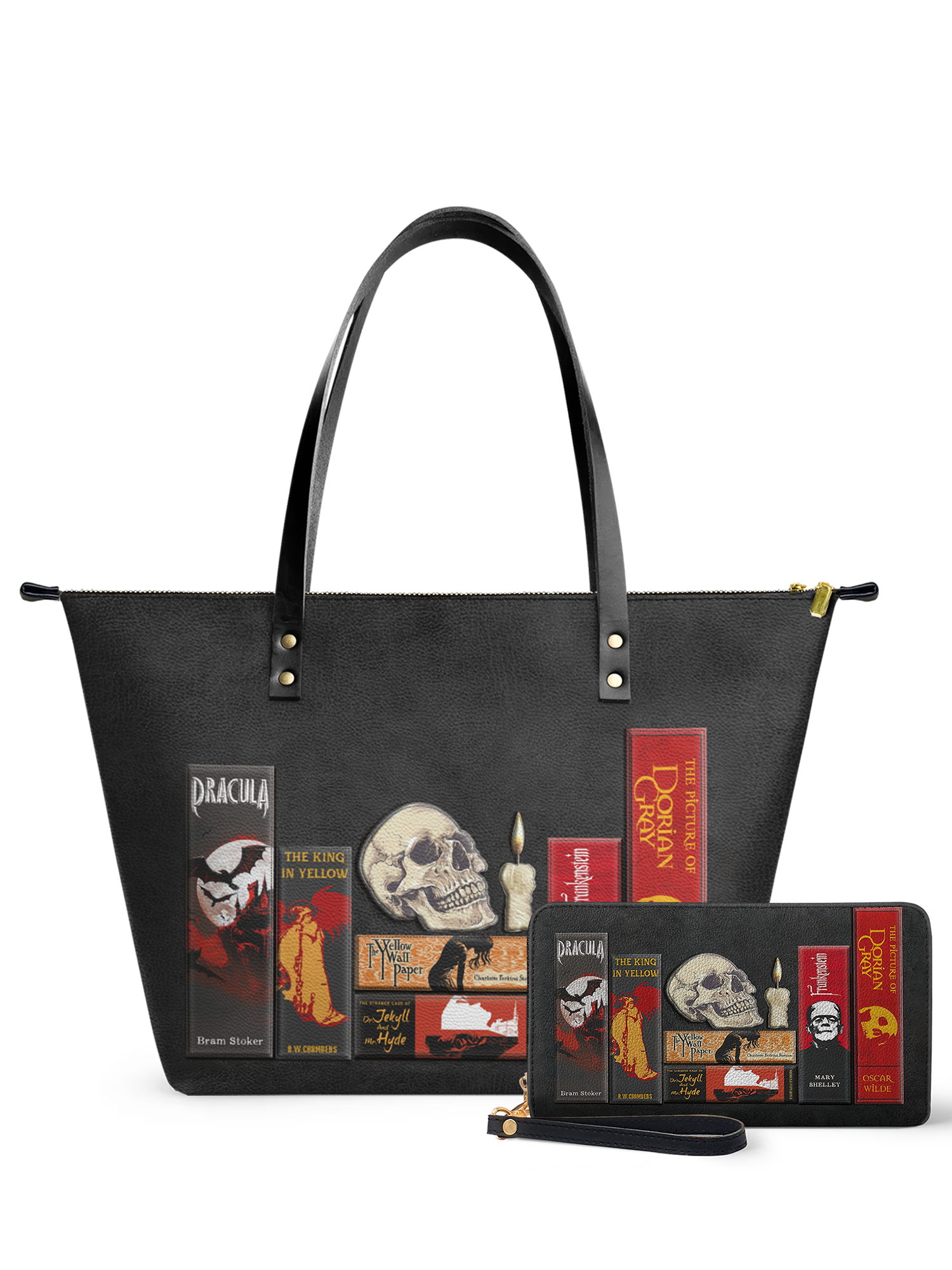 This Codex of Gothic Tales Leather Tote is the perfect mix of mystery and macabre. Featuring Dracula, Frankenstein, The Picture of Dorian Gray, and more, it's like carrying a haunted library with you. A skull, a flickering candle, and deep, moody tones set the stage for classic horror fans, dark academia lovers, and anyone drawn to gothic elegance. Books tell stories—this tote tells yours.