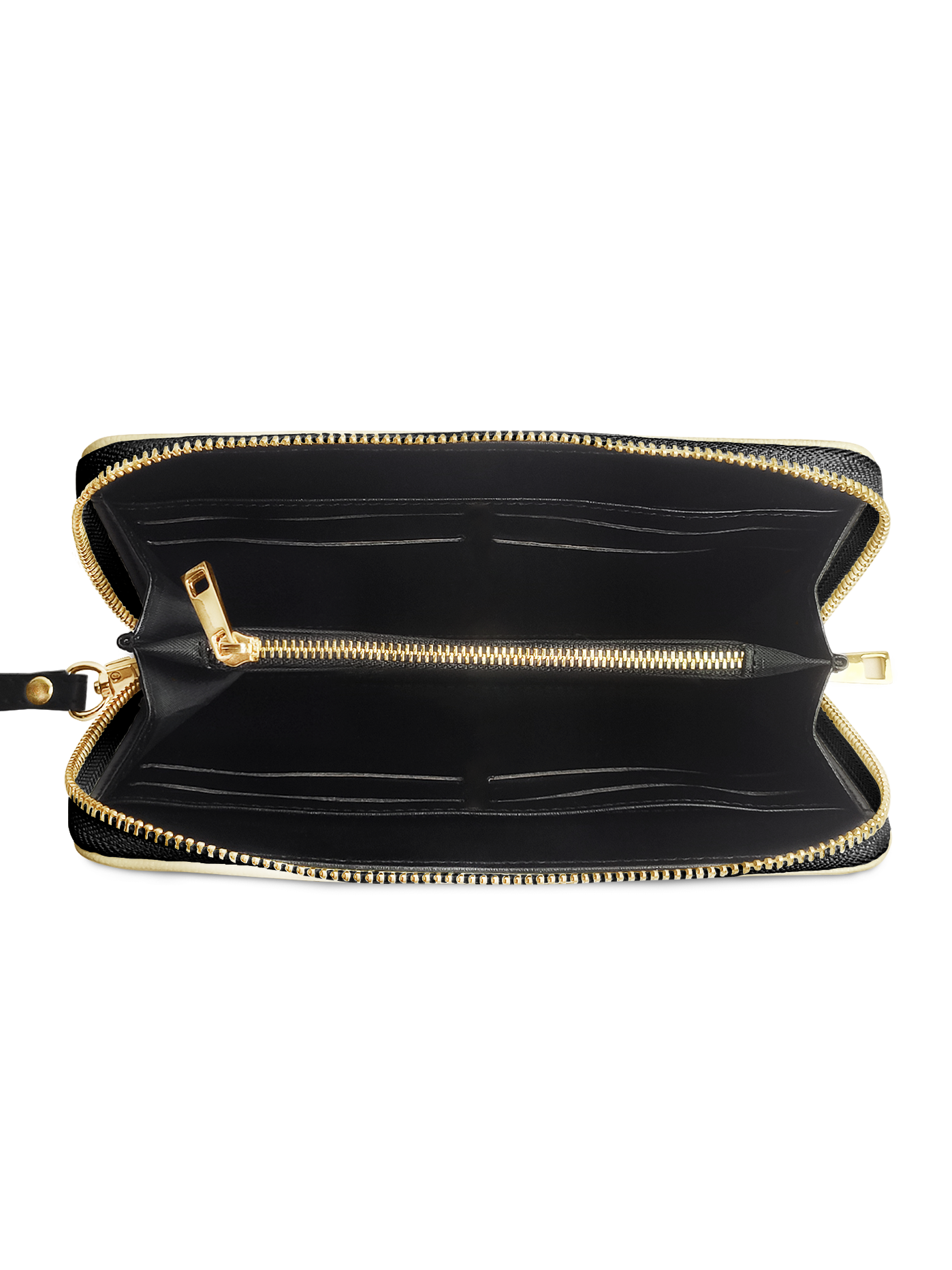 This wallet is spacious and stylish, holding beauty essentials, cash, cards, and a phone with ease.