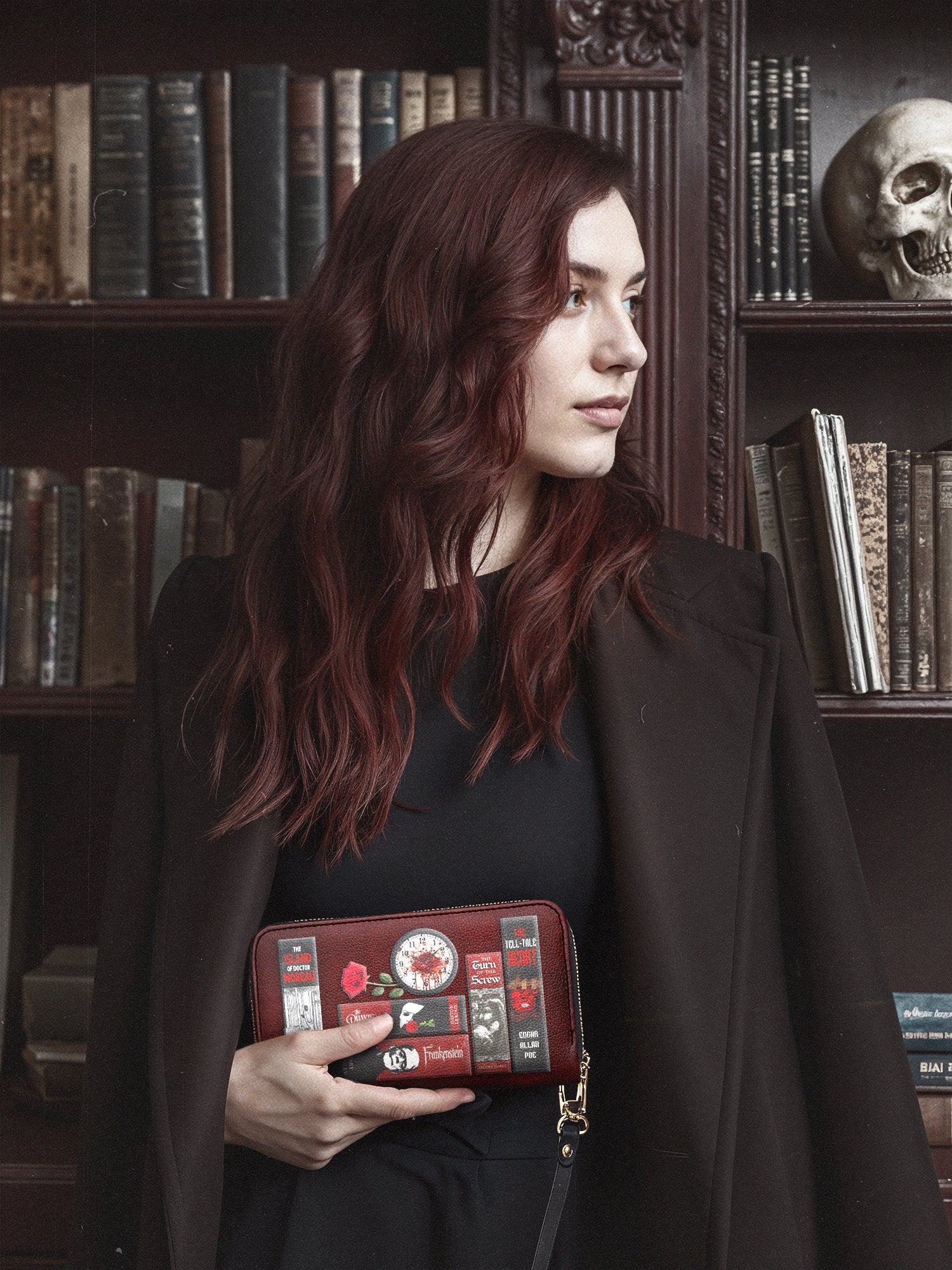 So I ordered a wallet. The " Poe Library" in ashen black. I already had a purse and really didn't think I needed another one but I really needed a new wallet.. But the problem was I really wanted the "Poes Library" in that gorgeous blue. So I did what anybody else would do the next day.I ordered it and the matching wallet. I got them all the same day.I fell in love with my blue purse! All my favorite stories ,the man himself , the blue, the black ....gorgeous. The interior, that soft yellow, Perfect! Enough room for everything that I need.