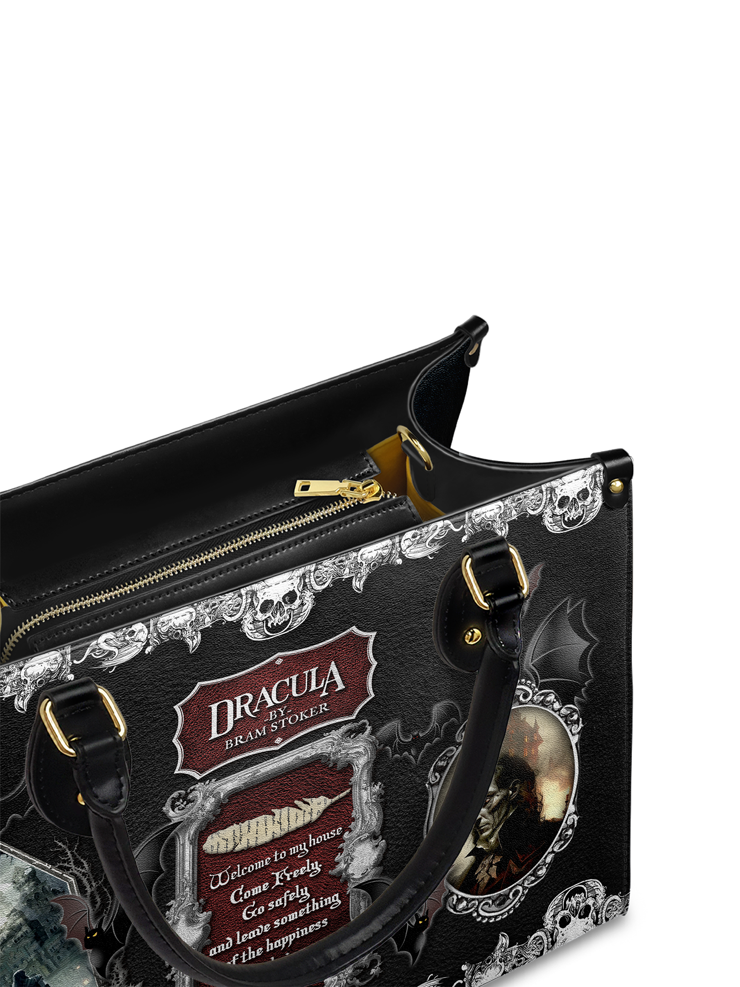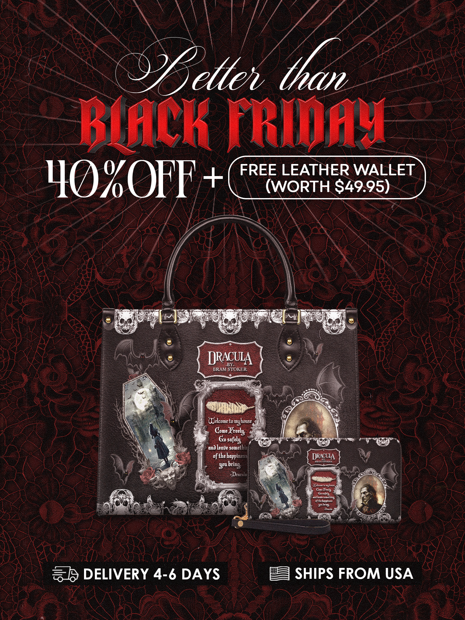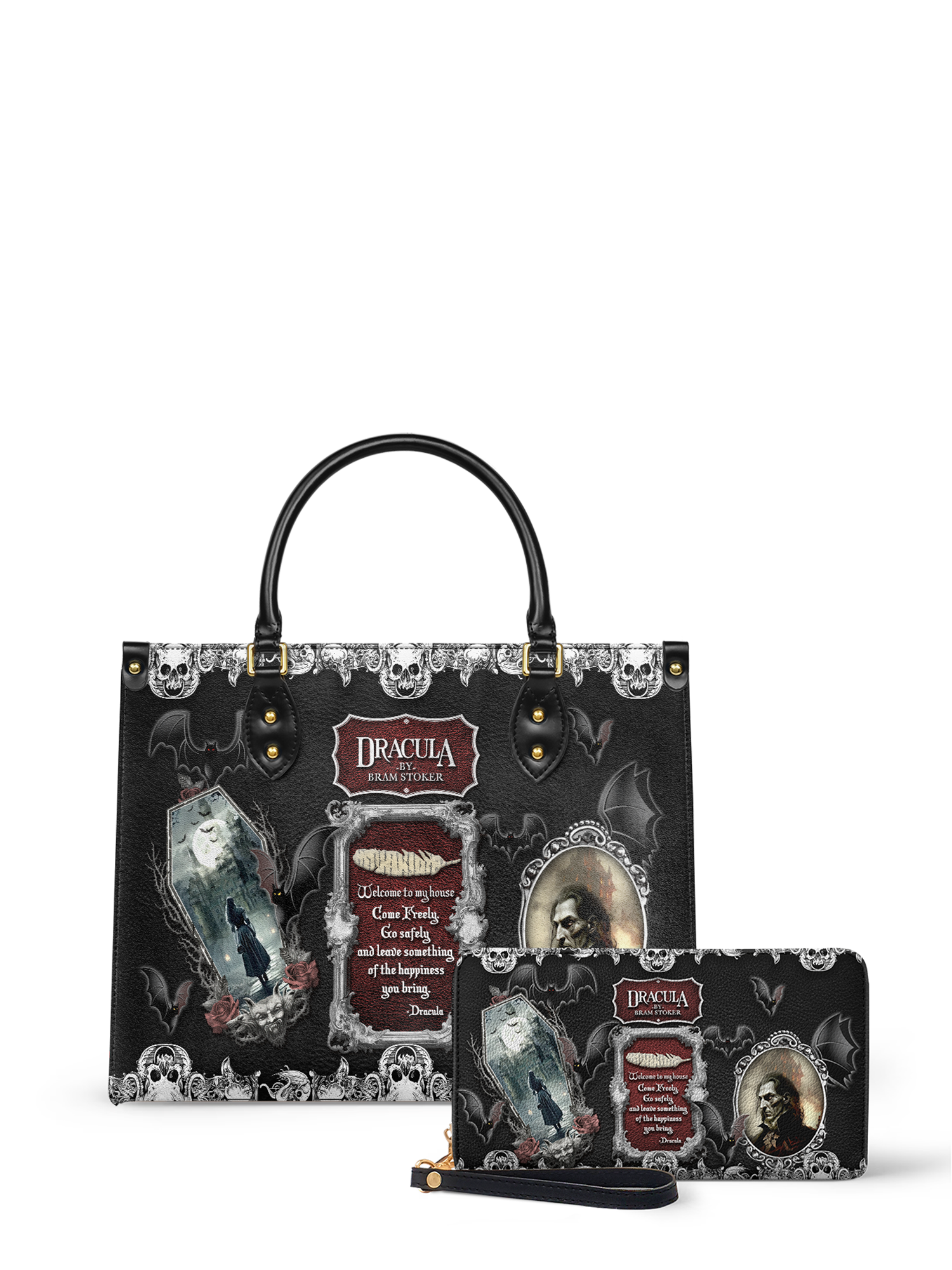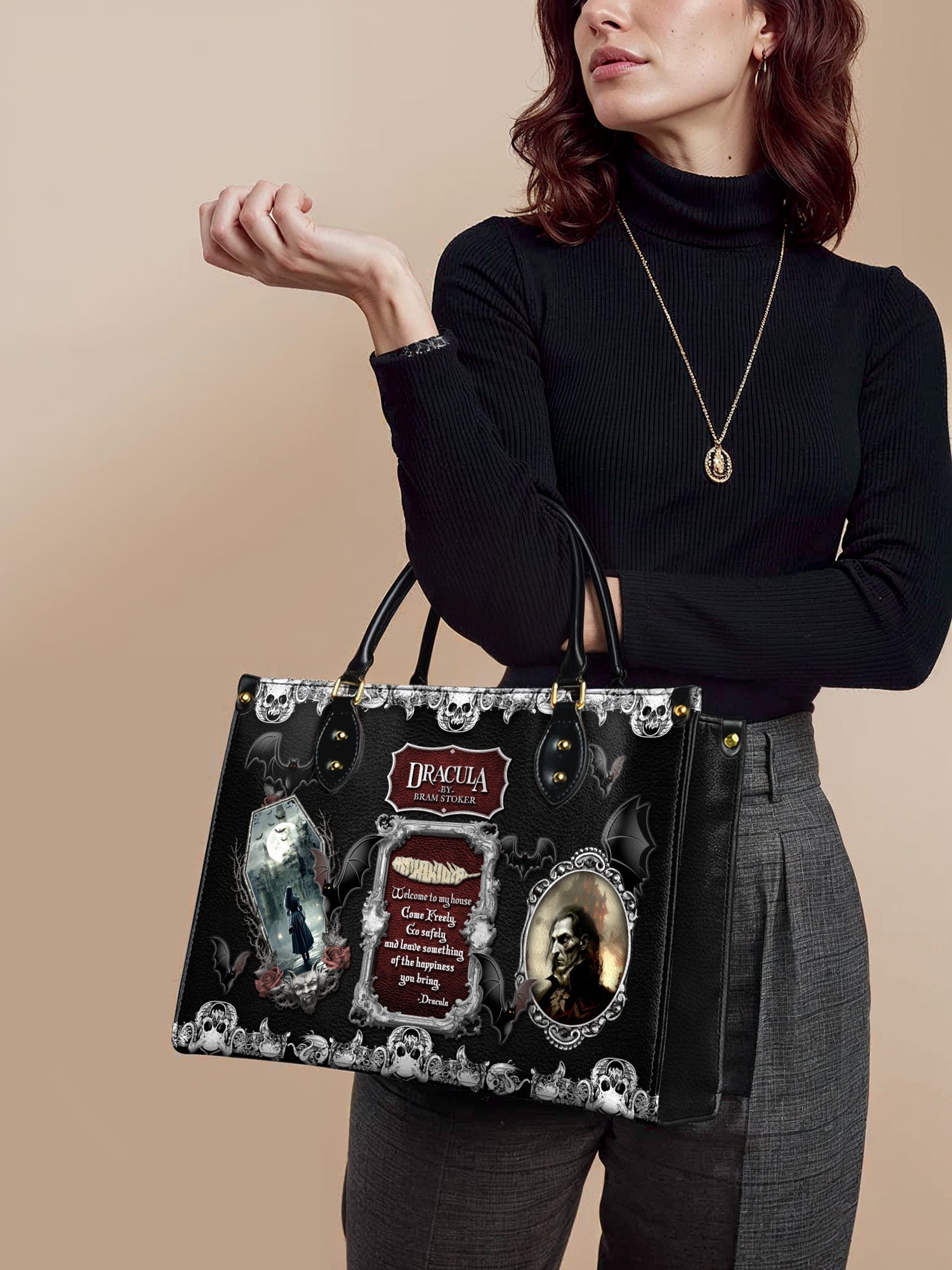 This Dracula Leather Handbag is dark, gothic, and full of eerie charm. The haunting design features Count Dracula, bats, skulls, and an eerie castle, all wrapped in vintage horror vibes. A chilling quote invites you into the vampire’s world—if you dare. Made from high-quality leather with sturdy black handles and gold details, this bag is perfect for book lovers, horror fans, and anyone who finds beauty in the shadows. Enter freely… and carry a little darkness with you.