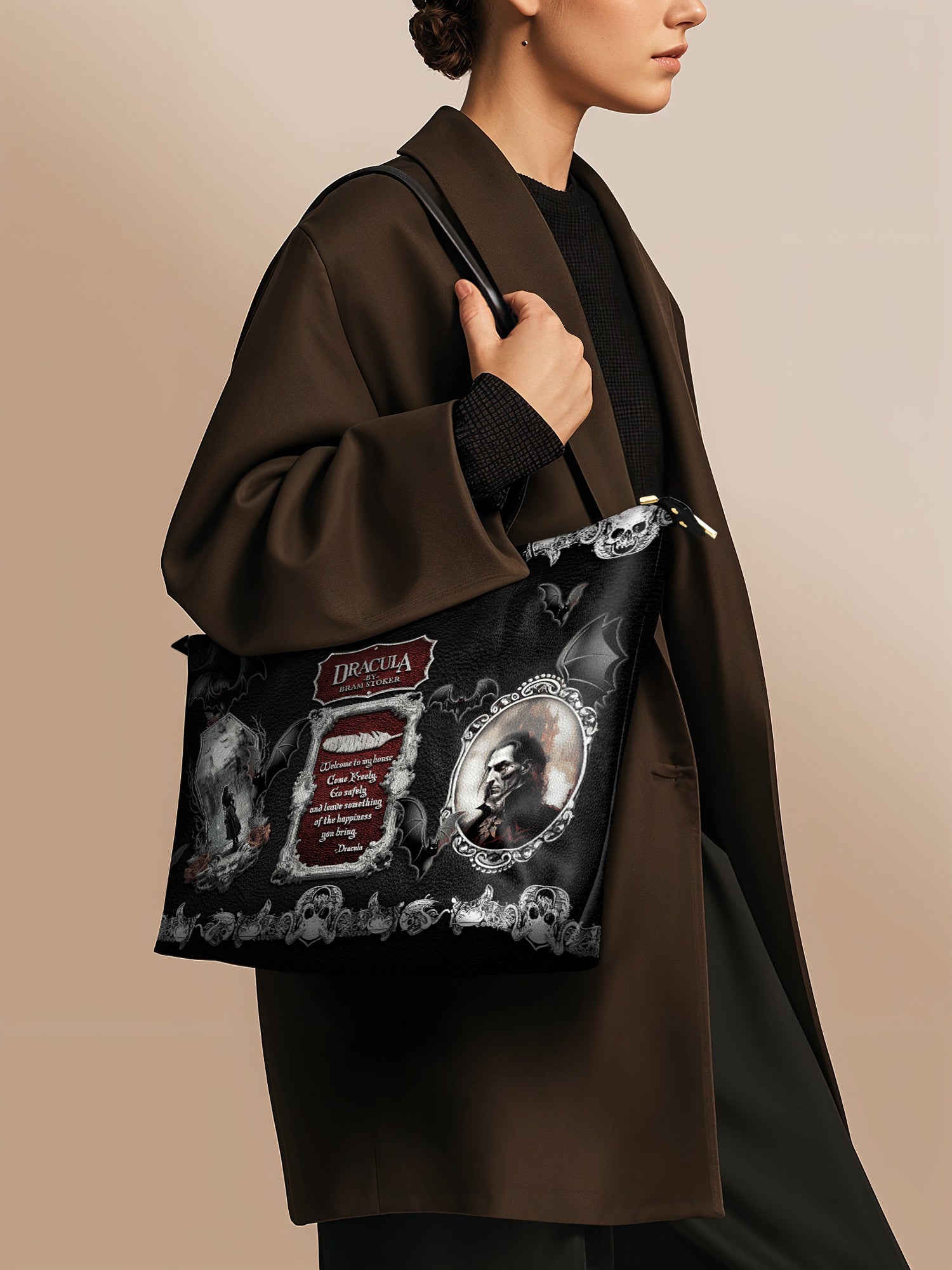 This tote is the chameleon of the crypt: sling it over a wool cape for windswept walks reciting Annabel Lee, or pair it with tailored blacks for a midnight masquerade.