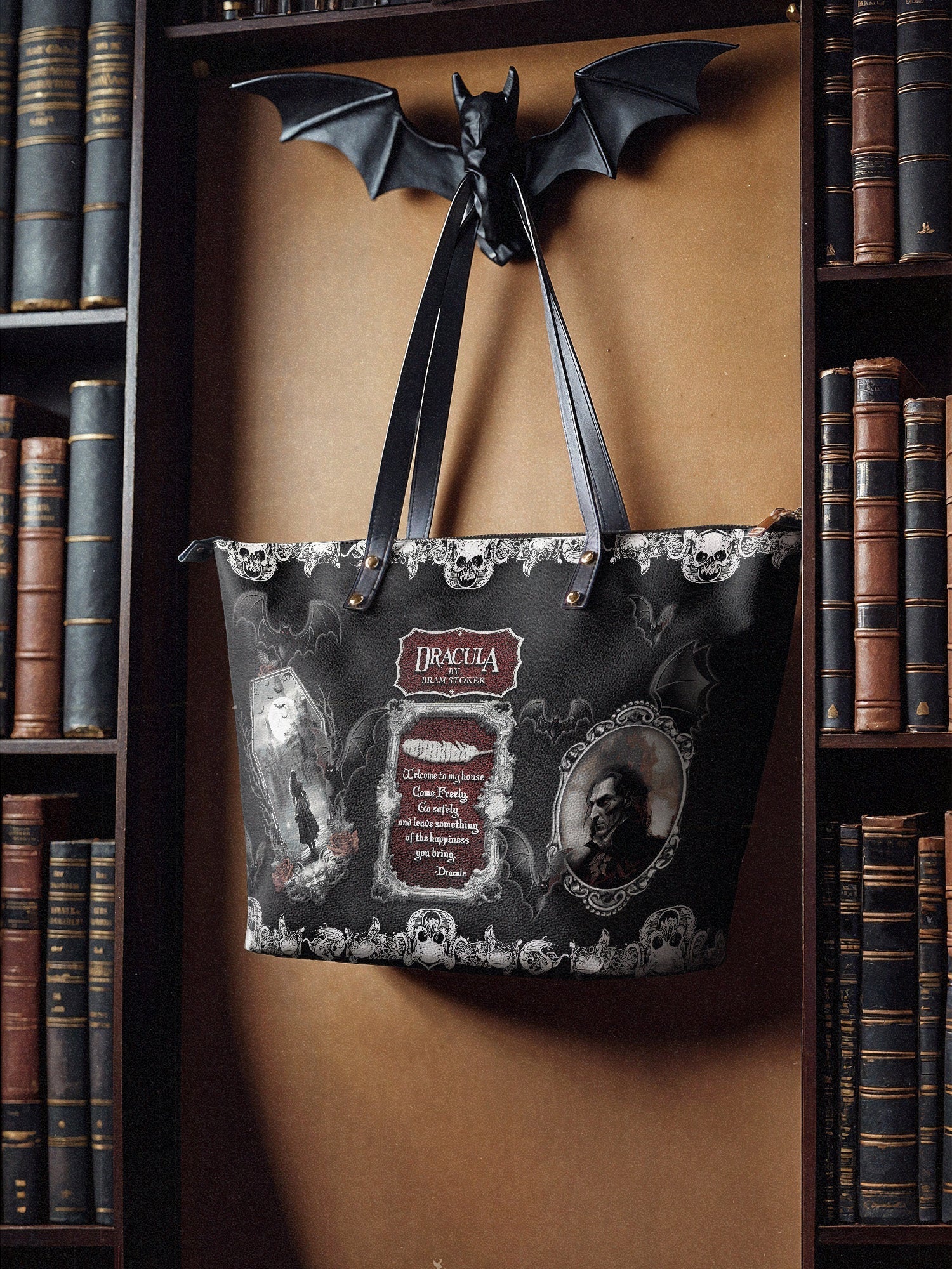 If your heart beats to the rhythm of being buried alive or placed in premature entombment, Lettoria's Poe's Library Tote is your talisman.