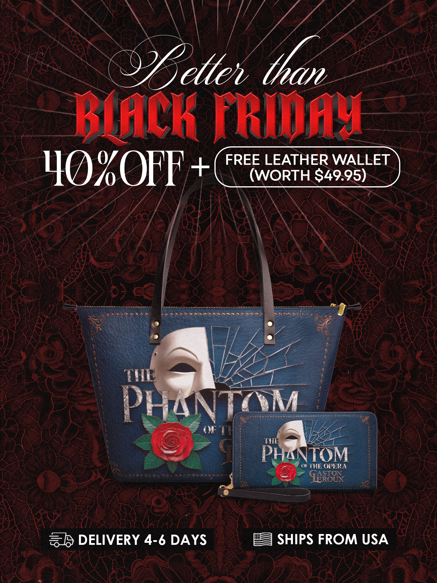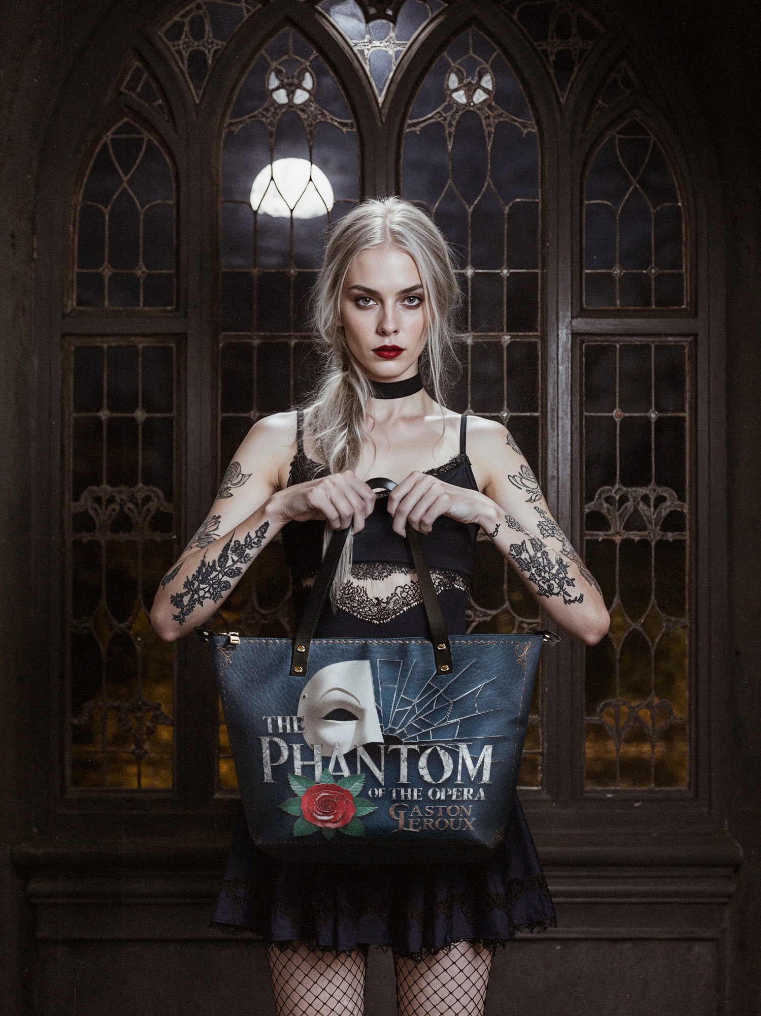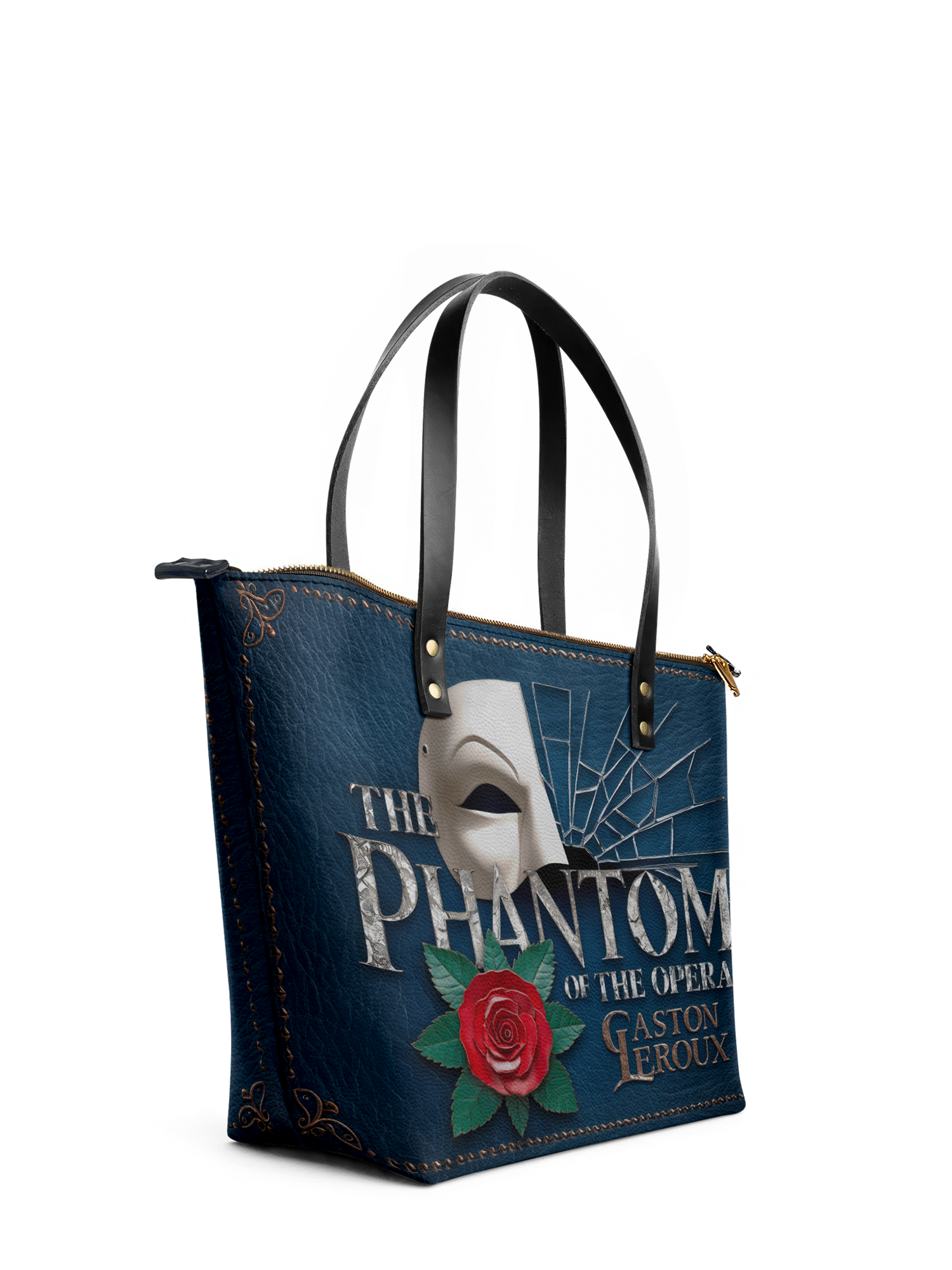Darkly romantic and rich with gothic flair, this Phantom of the Opera tote captures the tragic beauty of Leroux’s timeless tale. The iconic mask, the shattered glass, the crimson rose—it all comes together in one hauntingly elegant tribute to love, mystery, and music.