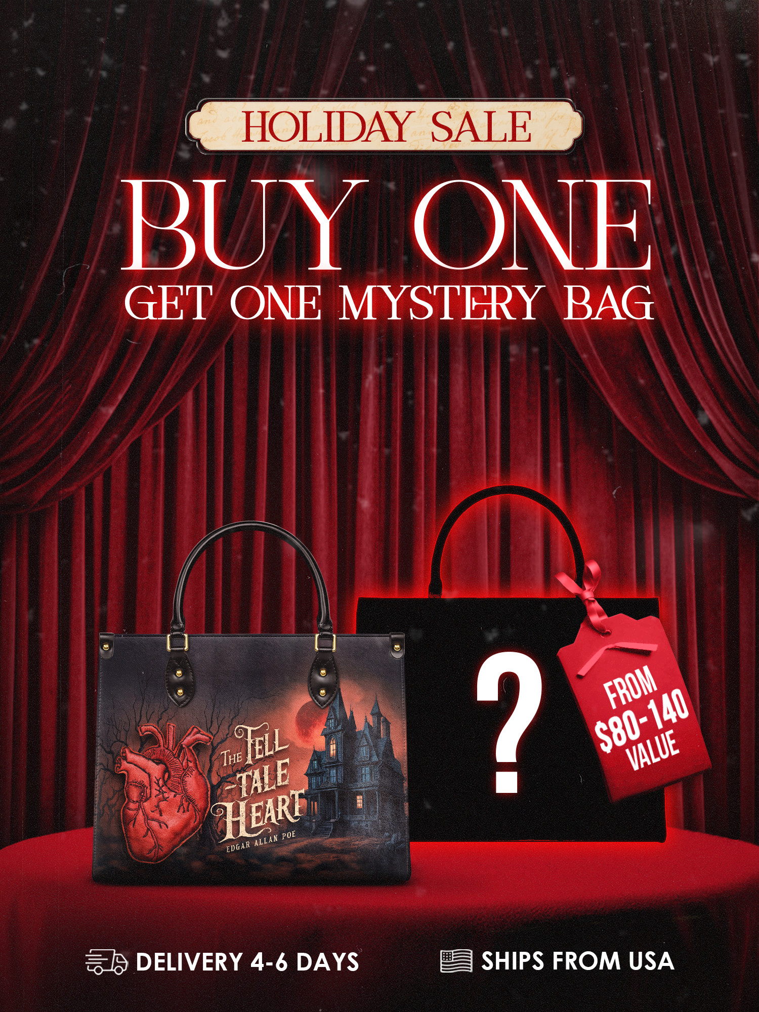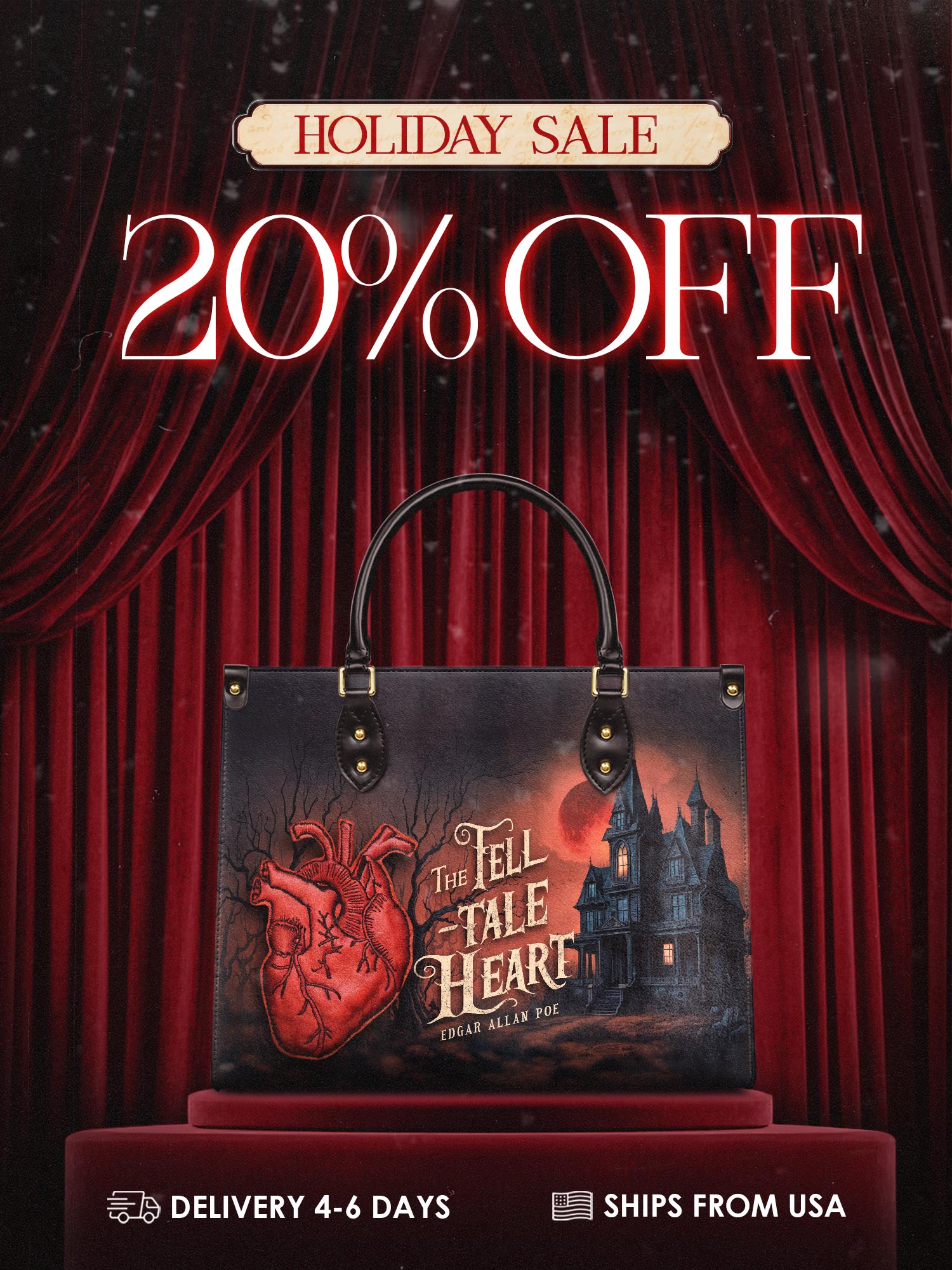 This The Tell-Tale Heart Leather Handbag is dark, eerie, and impossible to ignore. The chilling design features a beating heart, a haunted house, and a blood-red moon—straight from Poe’s twisted tale. It’s haunting, dramatic, and full of gothic mystery. Made from high-quality leather with black handles and gold accents, this bag is perfect for book lovers, horror fans, and anyone drawn to the macabre. Can you hear it? The heart still beats…