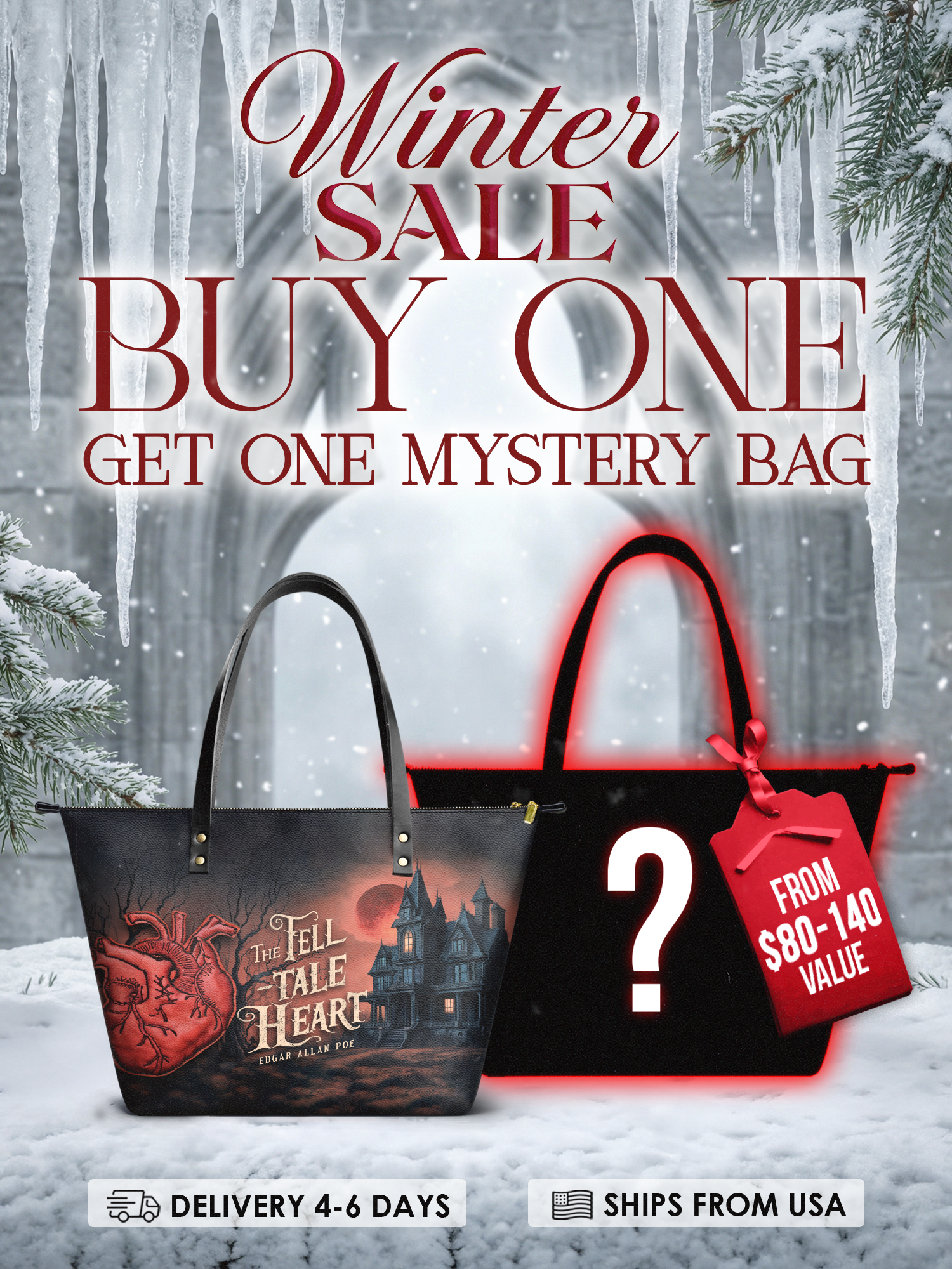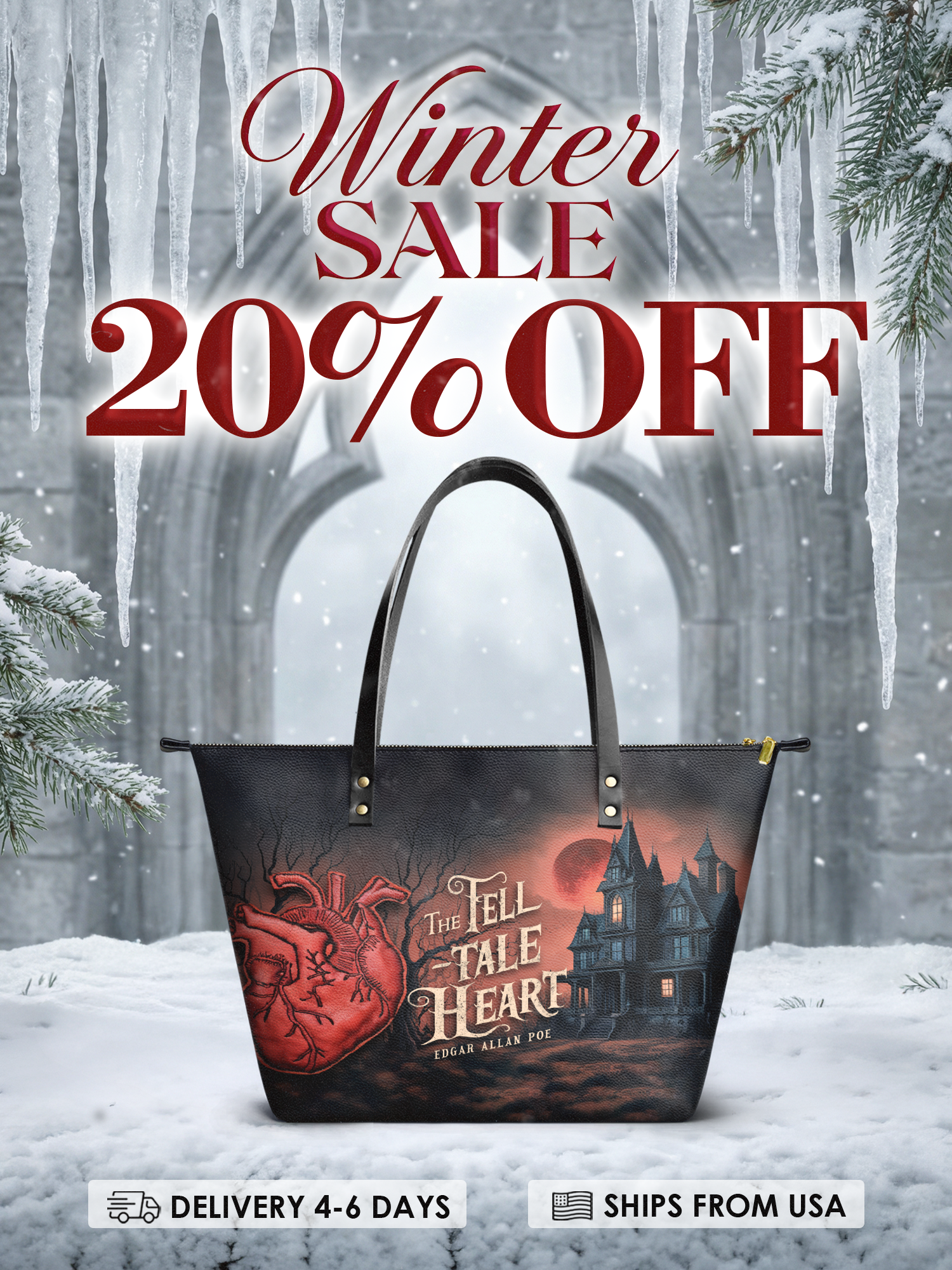 This The Tell-Tale Heart Leather Tote is eerie, bold, and dripping with gothic horror. The haunting design features a pulsing red heart, a shadowy haunted house, and a blood-red moon—straight from Poe’s chilling masterpiece. It’s dark, dramatic, and full of mystery. Made from high-quality leather with sleek black handles and gold accents, this tote is perfect for book lovers, horror fans, and anyone who feels the heartbeat beneath the floorboards. Can you hear it? It never stops…