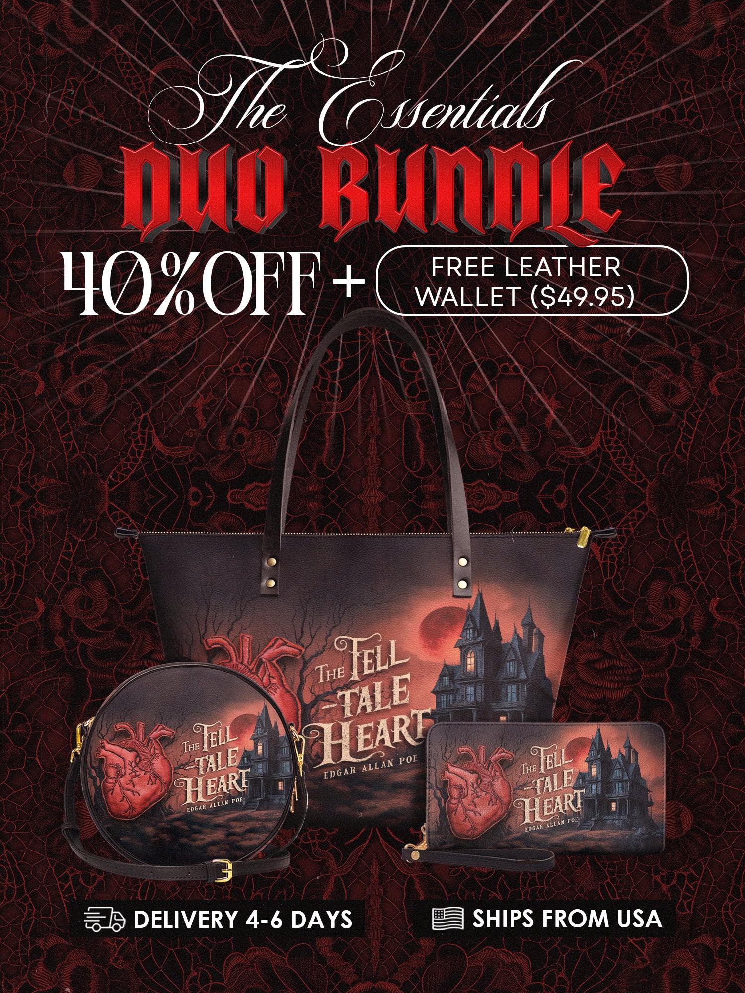 Handcrafted in the United States, this Premium Vegan Leather tote transforms mundane errands into a procession through the House of Usher.