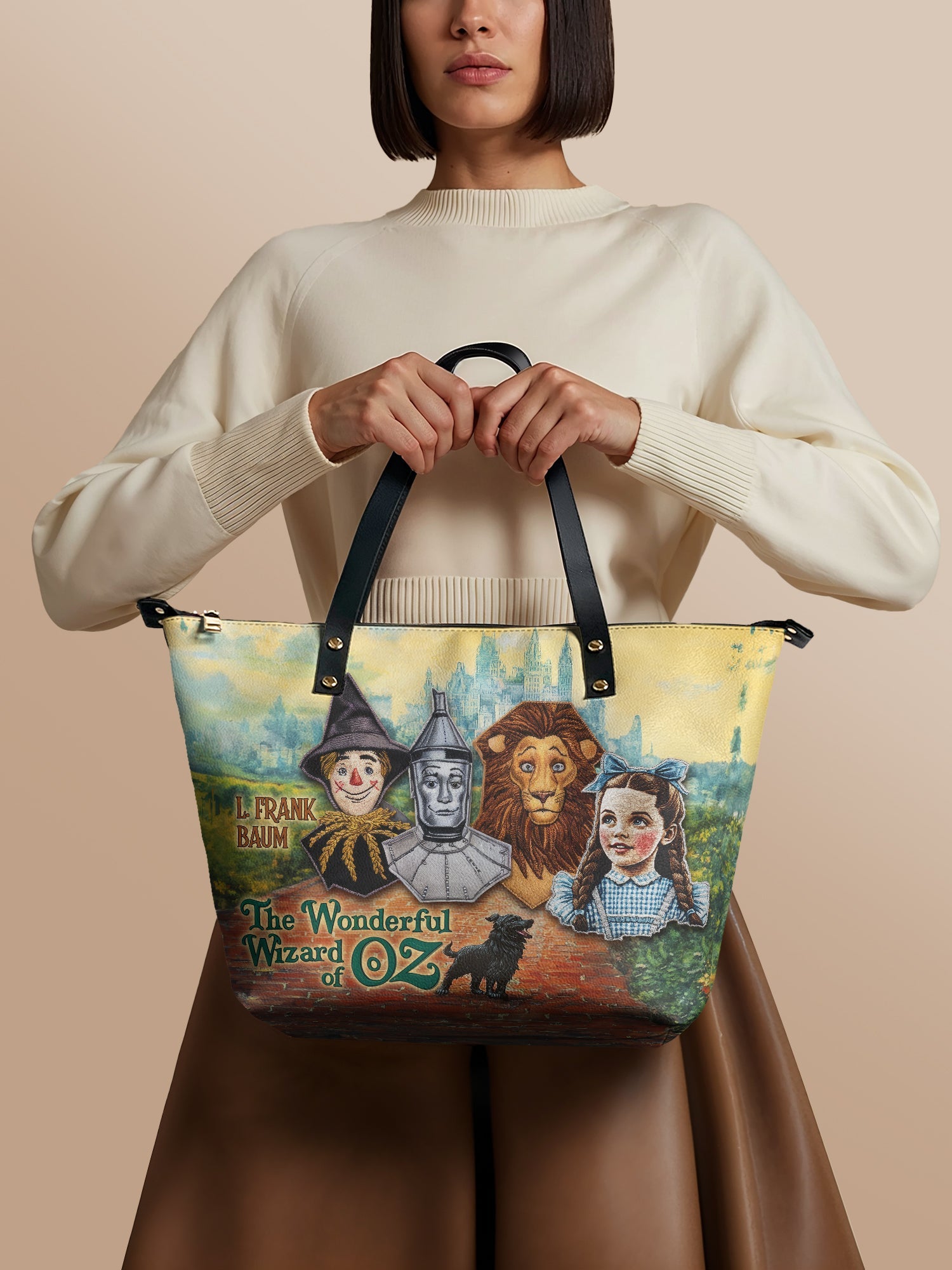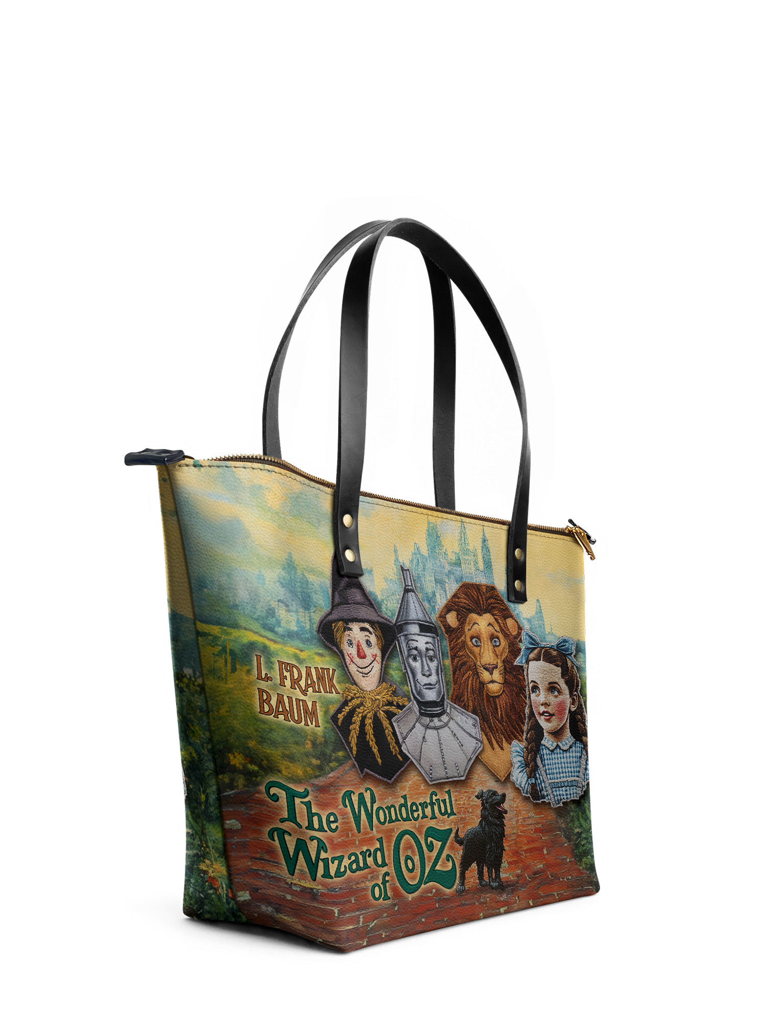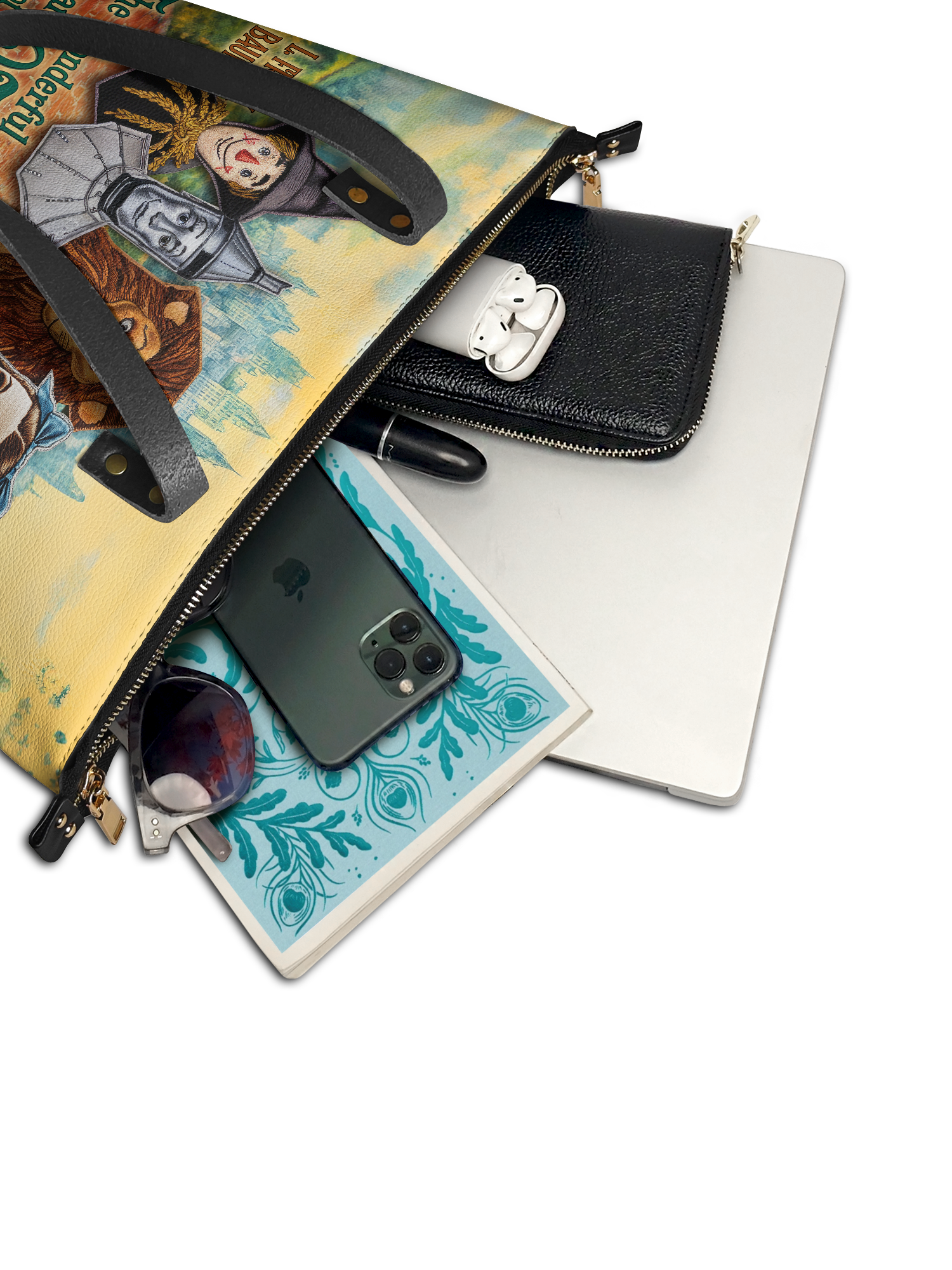 This Wonderful Wizard of Oz Leather Tote is a journey down the yellow brick road. The vintage-style design brings Dorothy, Toto, and her friends to life as they head toward the Emerald City. The colors are warm, the details are timeless, and it feels like stepping right into the story. Made from high-quality leather with sleek black handles and gold accents, this tote is perfect for book lovers, dreamers, and anyone who knows there’s no place like home.