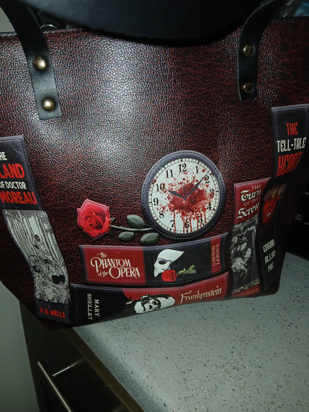 Handcrafted in the United States, this Premium Vegan Leather tote transforms mundane errands into a procession through the House of Usher.