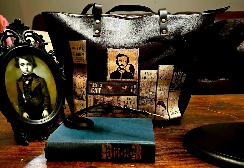 Subtle stitching mimics aged binding, and a hidden interior quote – "All that we see or seem is but a dream within a dream" – winks from the lining like a secret pact with the macabre.